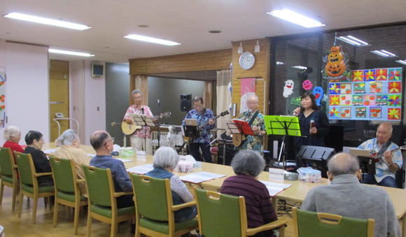 様々なボランティアのみなさまが定期的に訪れてくださり、歌や音楽などを通じて、ご利用者・職員といっしょに、楽しい時間を過ごしています。