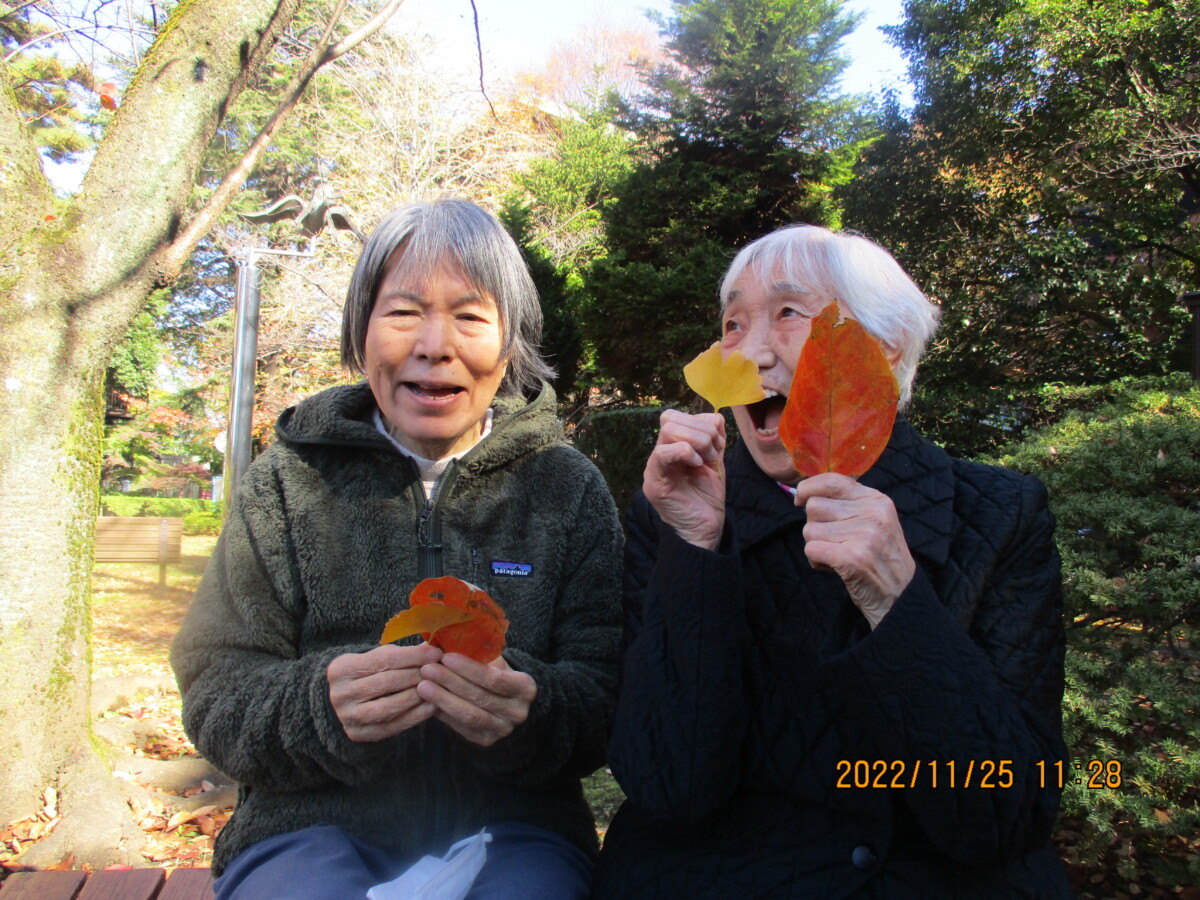 感染症予防対策を行いながら、短時間・少人数で綺麗に色づいたもみじやイチョウを観賞しに出かけました。「わあ、綺麗だね」と感動されていました。