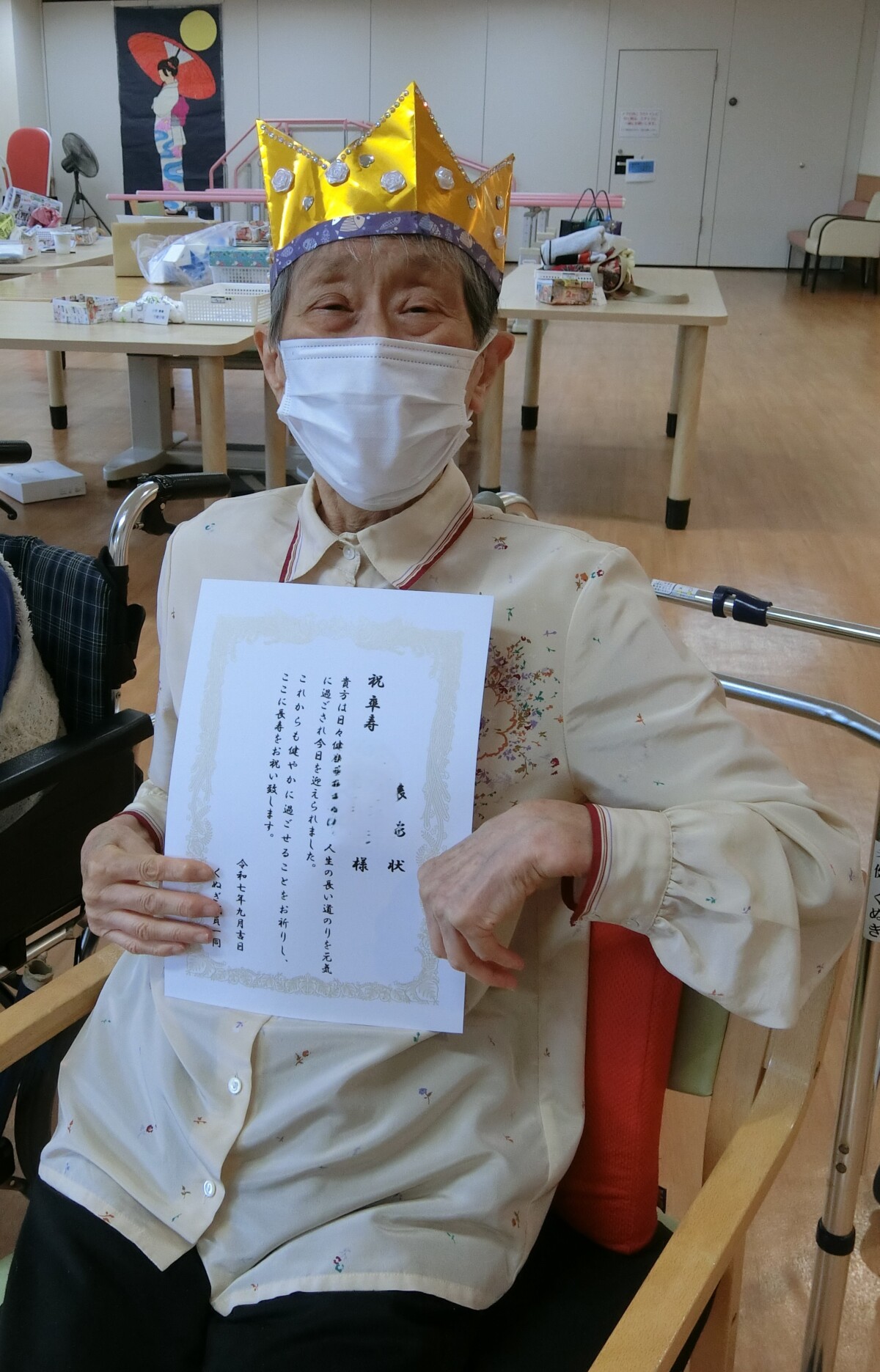 デイケアでは敬老会内で、ご長寿者に表彰状と王冠を贈呈しました。