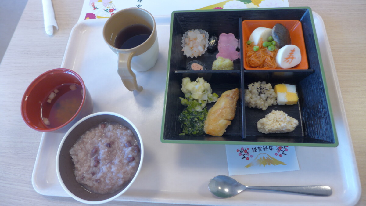 元旦の昼食には毎年恒例特製のおせちが出ました!きれいなお膳にご利用者も大変喜んでいました。