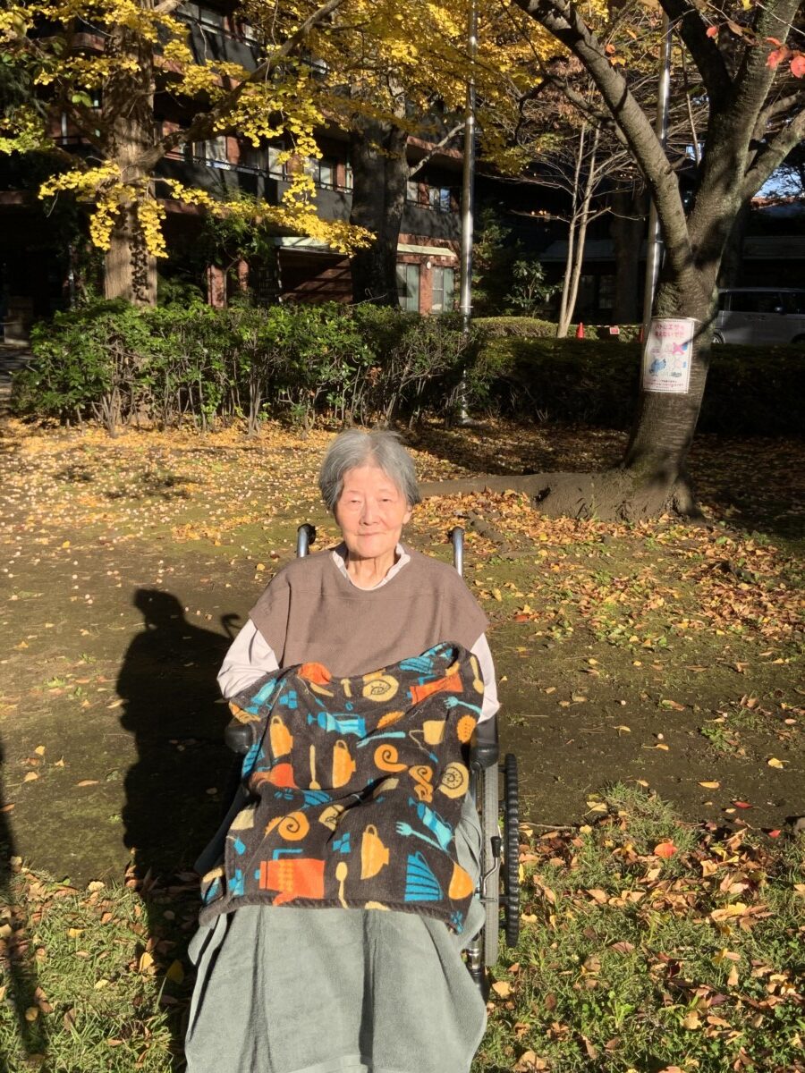 散歩された日は、池の亀も甲羅干しをしていて、日差しが暖かく感じました。園庭の銀杏やもみじが紅葉しているのを見て「綺麗ね。もうすぐ冬が来るわね。」と話されていました。