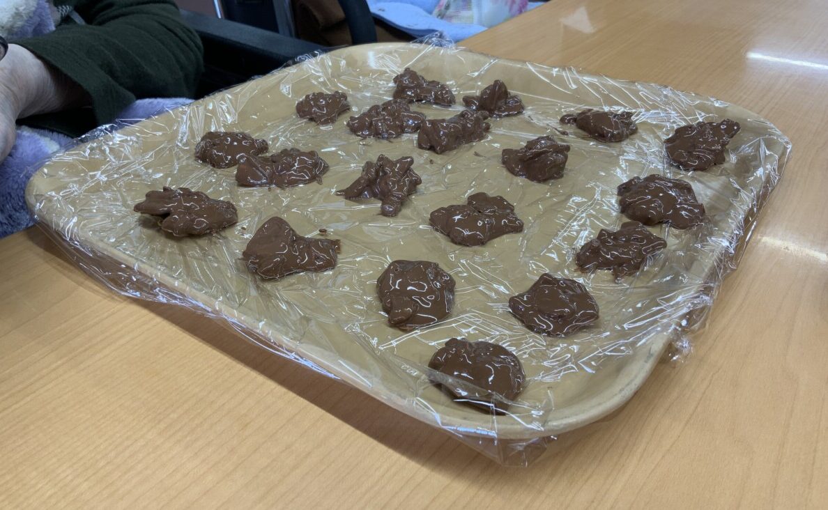 2月18日に行ったリハビリクッキングでは、クランチチョコとチョコプリンを作りました!