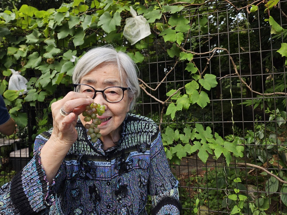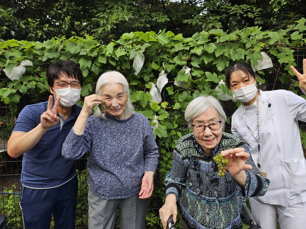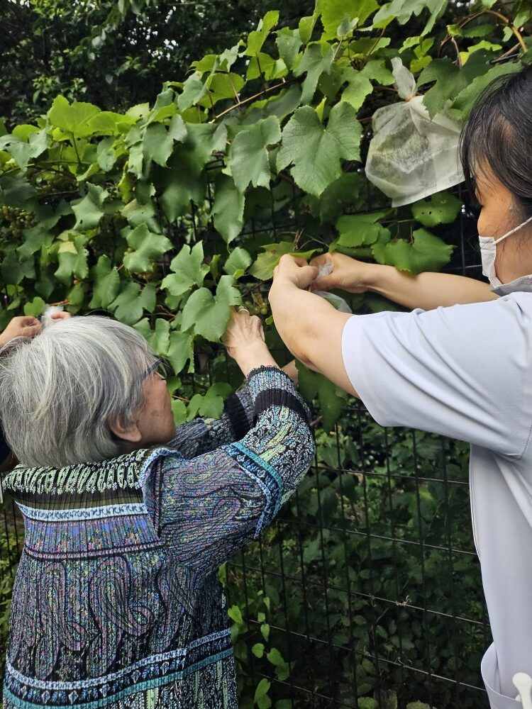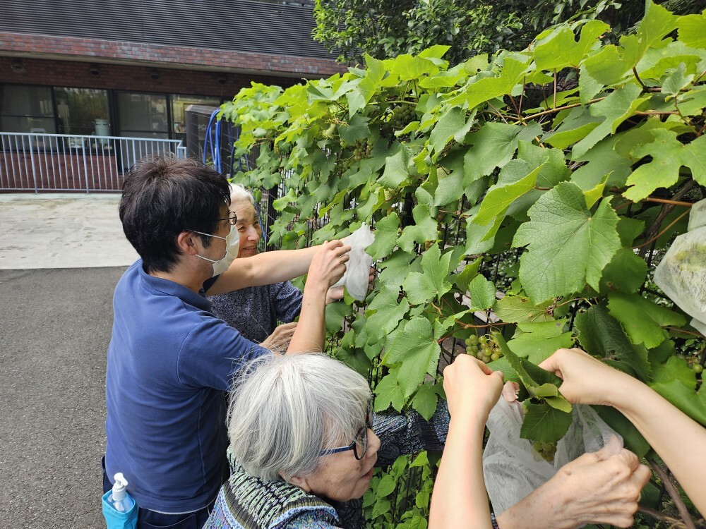 しかしながら・・・鳥や虫も実の美味しさを知ってか、たくさん味見をしてしまい、中々私たちが収穫して食べるまでたどりつきませんでした。そこで今年は、ご利用者とスタッフで、小さいぶどうの実に白い袋をかけて、ぶどうの成長を見守る事にしました!いつ頃収穫できるのか?楽しみです♪