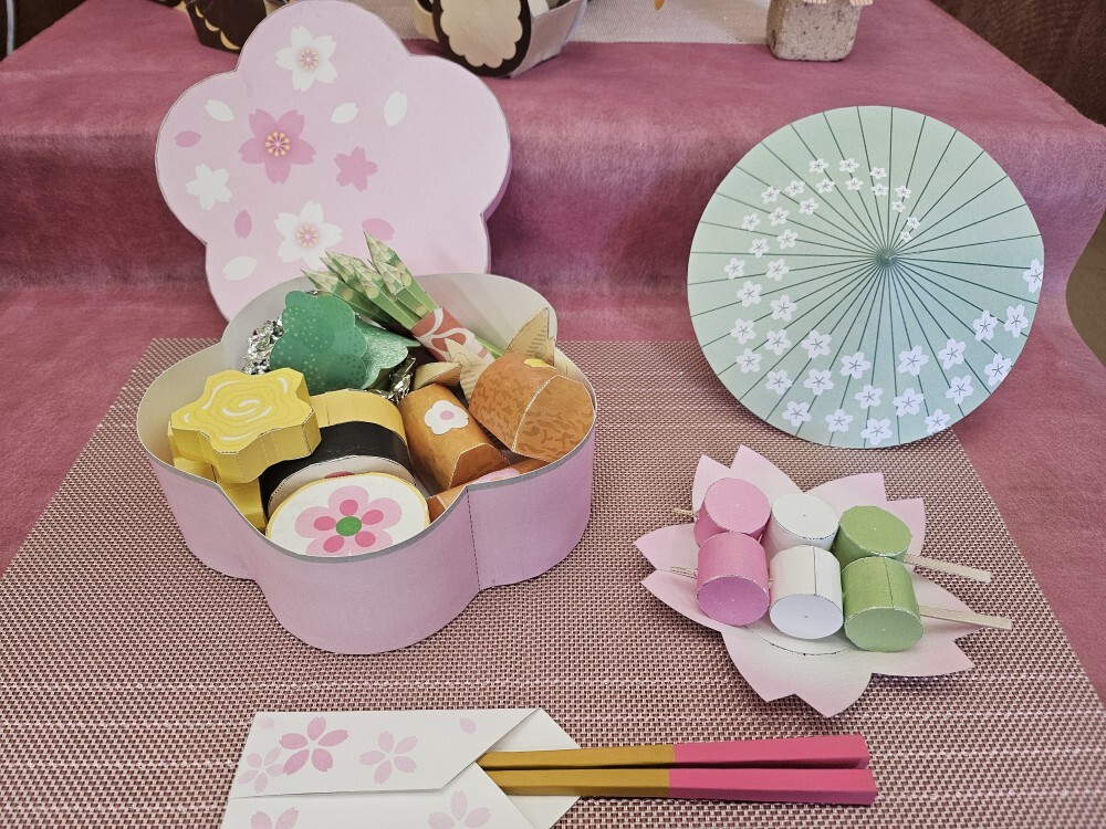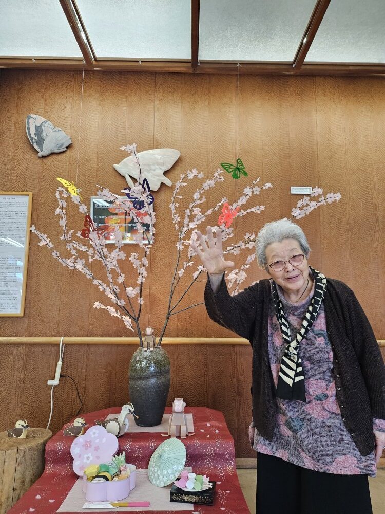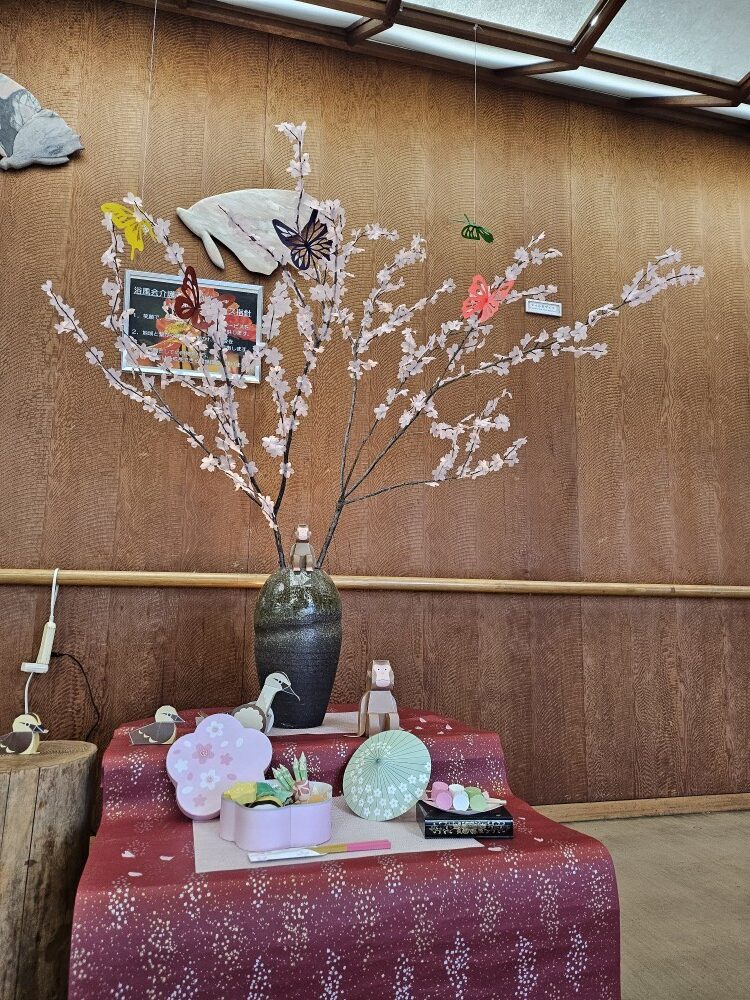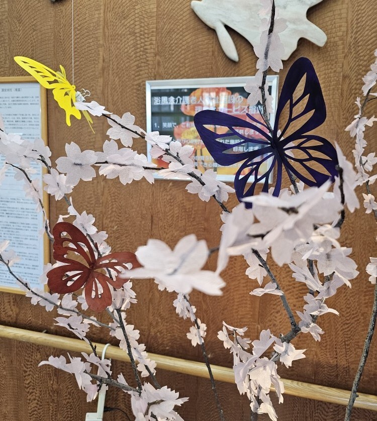 桜の花びらはご利用者の皆様が作業活動で制作し、一つひとつに心を込め、春への楽しみがたくさん詰まっています。お花見弁当やお団子🍡を一緒に飾りロビーははすっかりお花見気分です♪