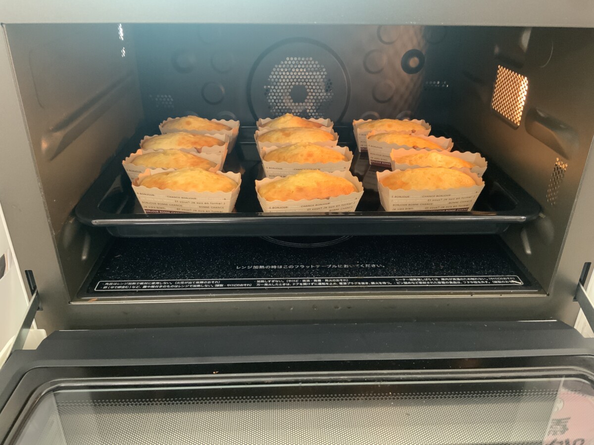 マドレーヌ生地を冷蔵庫で1時間寝かせてオーブンレンジで170℃にセットし16分焼きました。