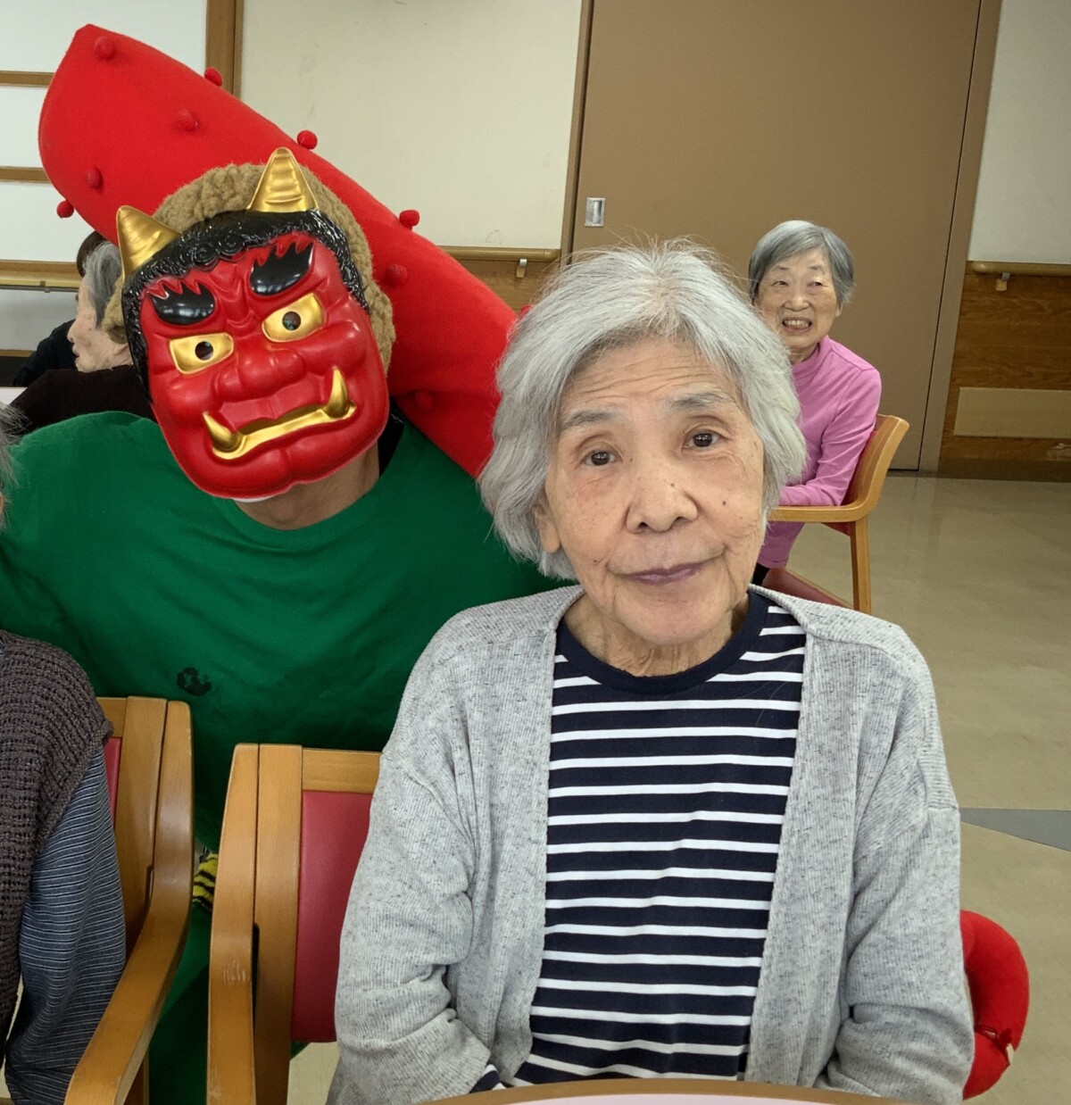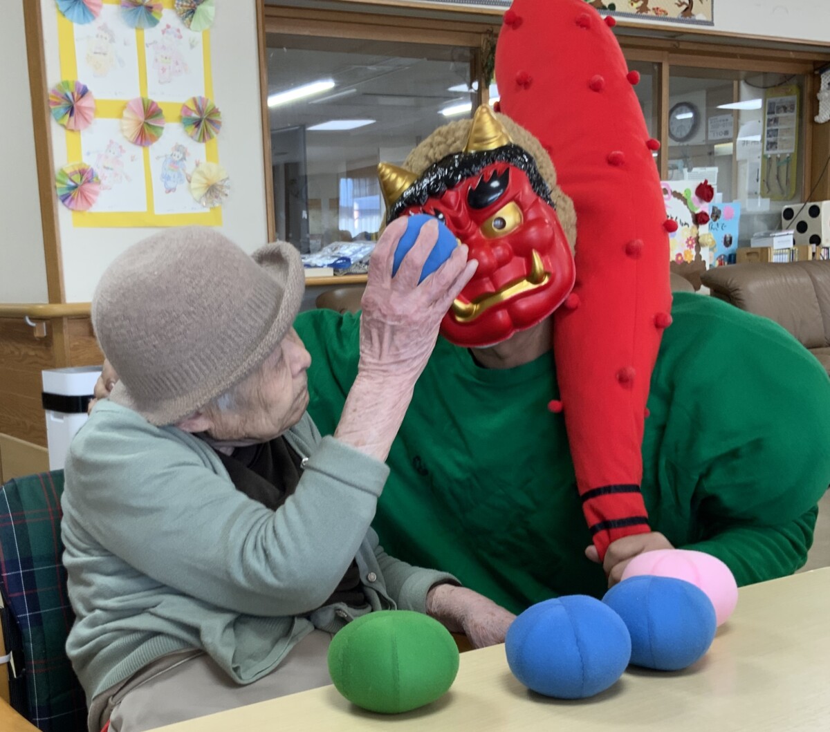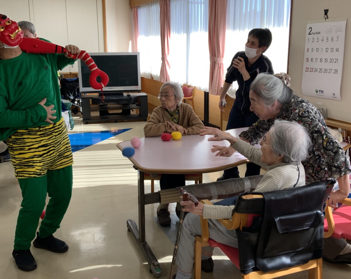 鬼にぶつける工夫をしました。もちろん希望があれば豆を食べて頂いて節分を楽しんでもらいました。