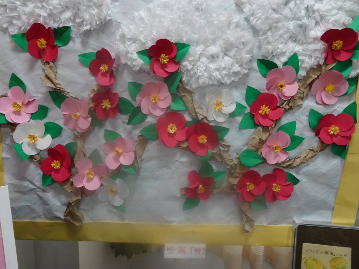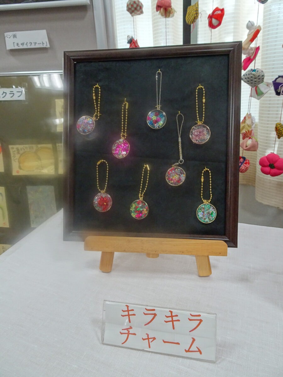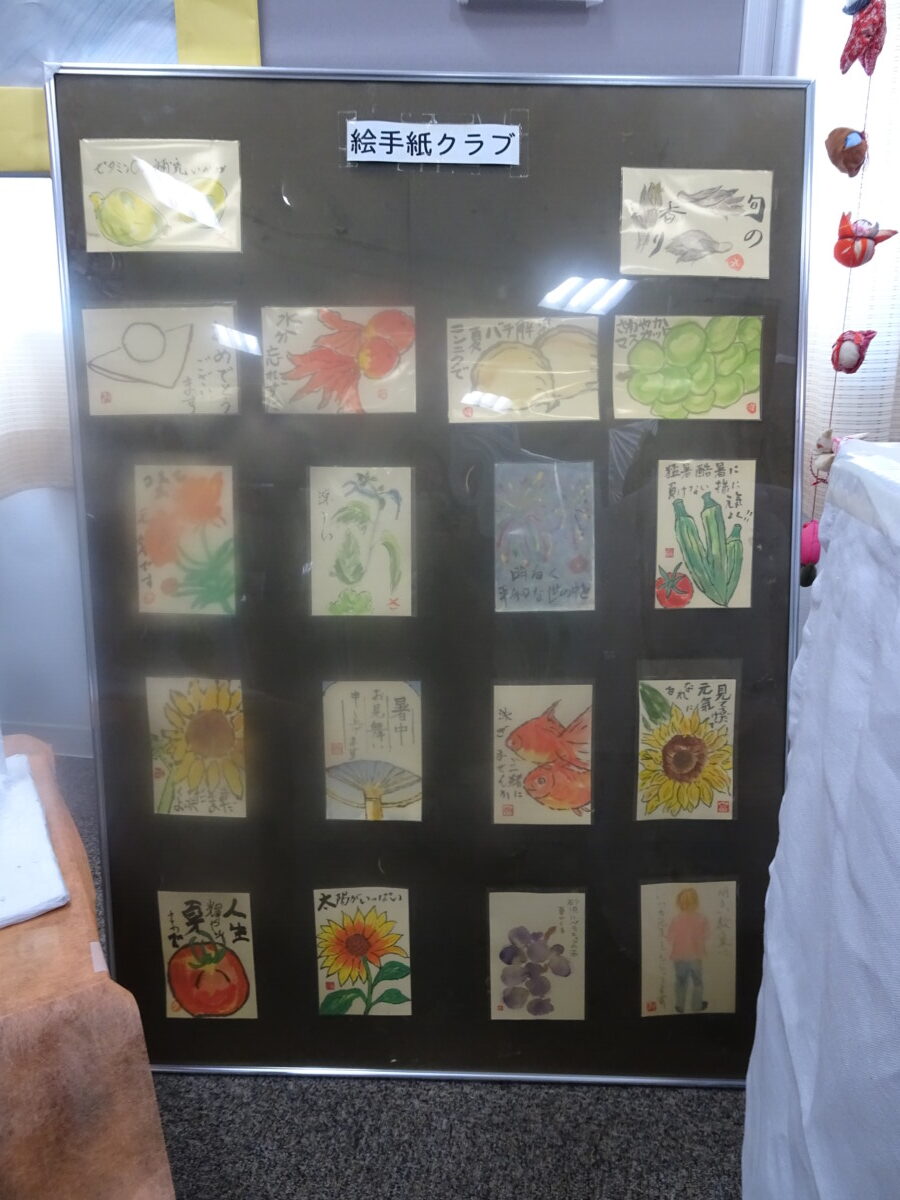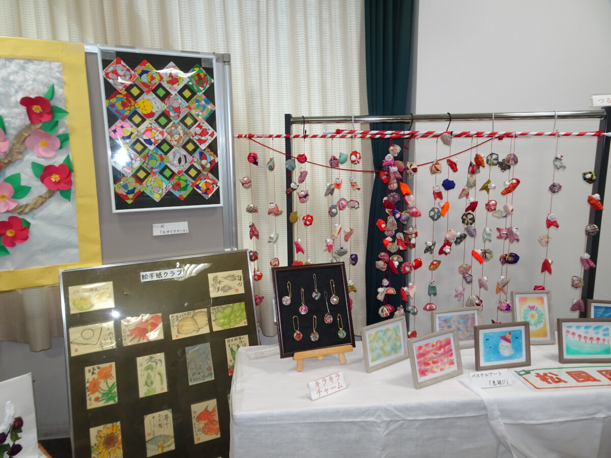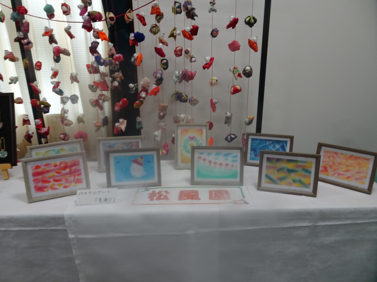 松風園からは、レクリエーションの作品作りで皆で作成した壁画『椿』『キラキラチャーム』『つるし雛』ペン画『モザイクアート』『絵手紙クラブの作品』を出品しました。どれも素晴らしい作品で来訪した方が足を止めて鑑賞している姿が印象的でした。