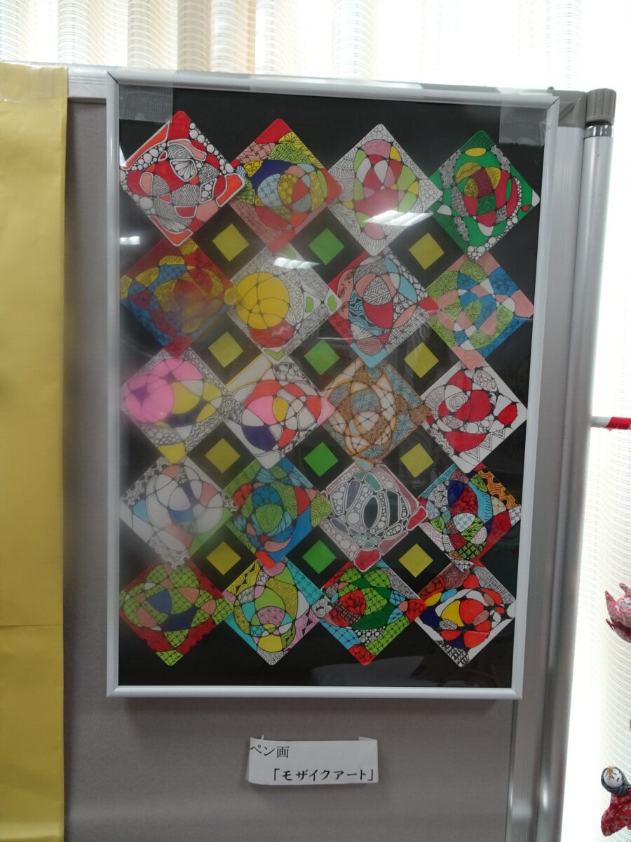 『ペン画』のモザイクアートは思い思いの線で根気よく描いていきます。色を付けた作品は花に見えたり人に見えたり色々な形に見えるところが面白いです。
