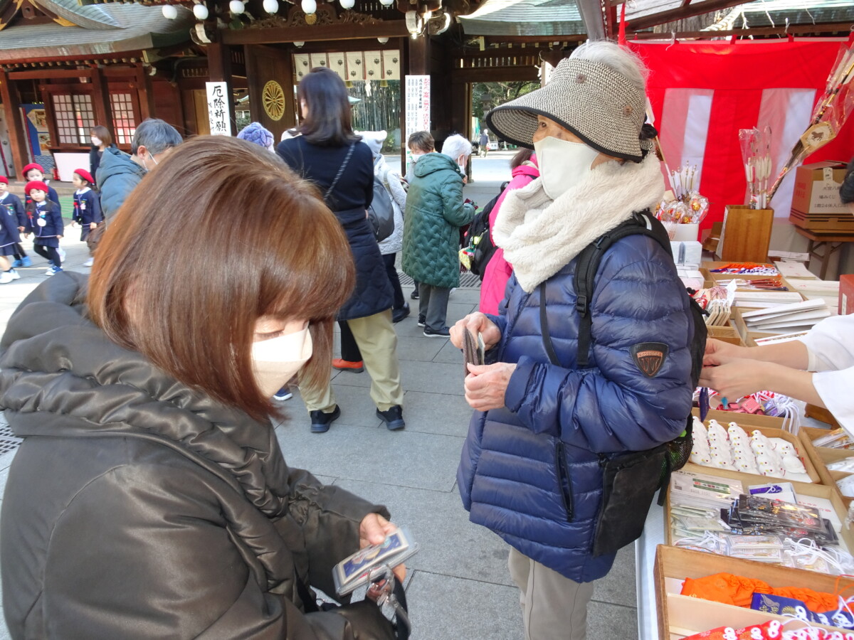 帰りに干支(午)のお守りを買って巫女さんにつけて頂きました。