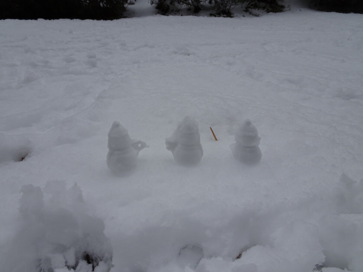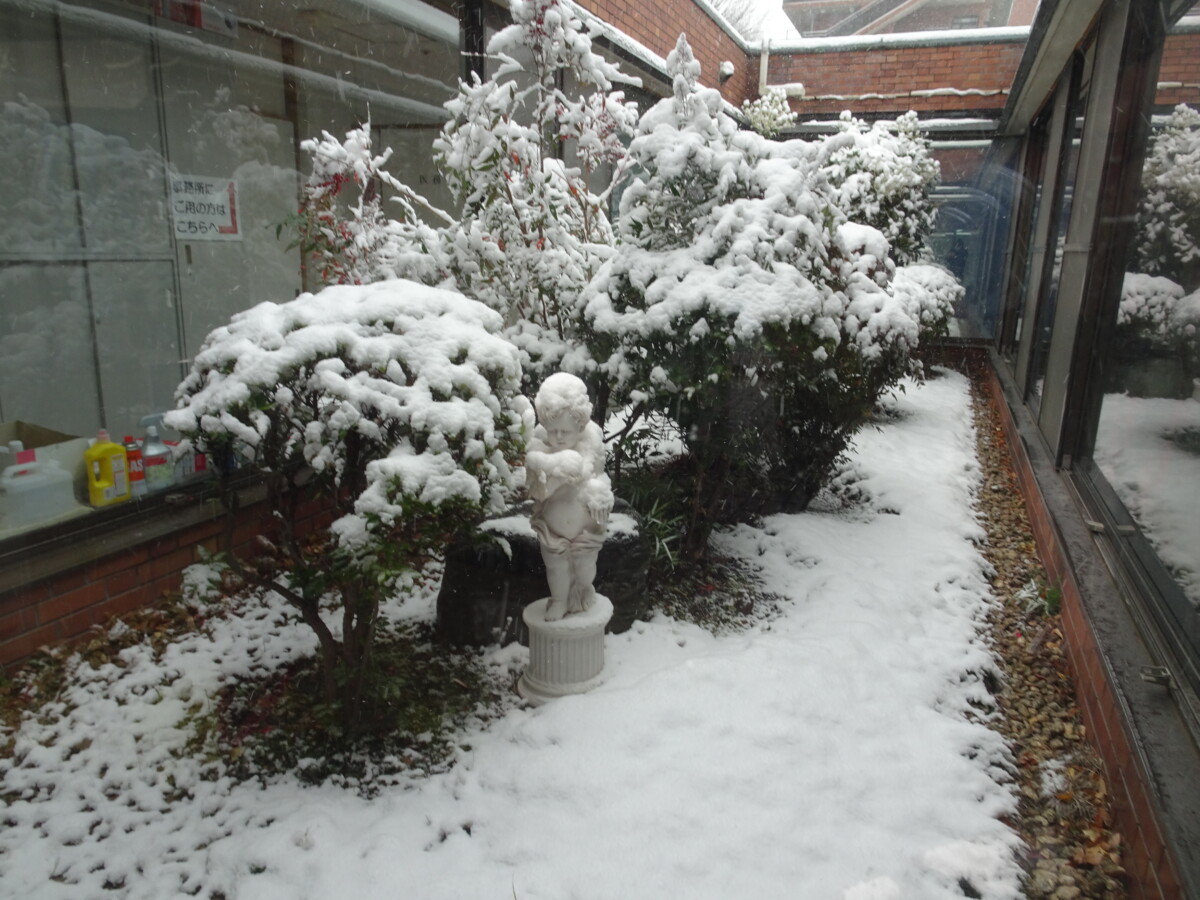 正面玄関の植木や中庭の彫刻物、食堂前の庭にも雪が積もりとても綺麗でした。