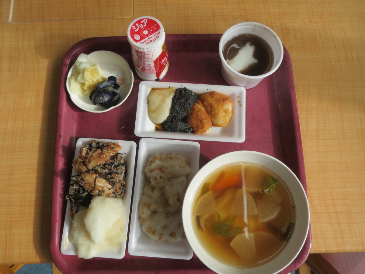 お雑煮、お汁粉、漬物と、きなこ、ごま、のりおかか、からみの6種類のお餅を頂きました。