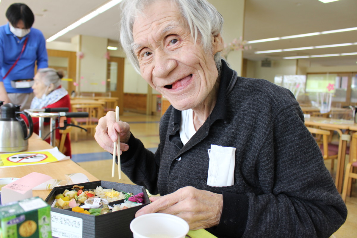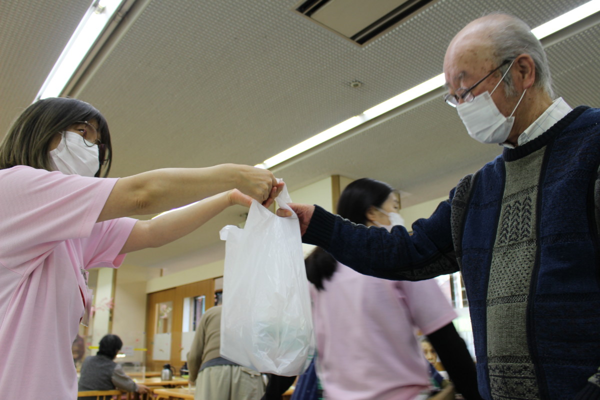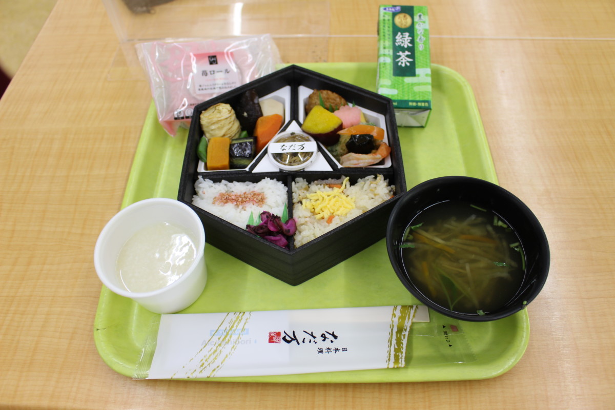他にも甘酒やロールケーキ、沢煮椀も付き、皆様から「豪華ね!」「お腹いっぱい。」「食べきれないわ。」というお声が多く聞かれました。お弁当は持ち帰ることもでき、居室でゆっくり召し上がる方もいらっしゃいました。